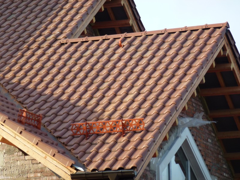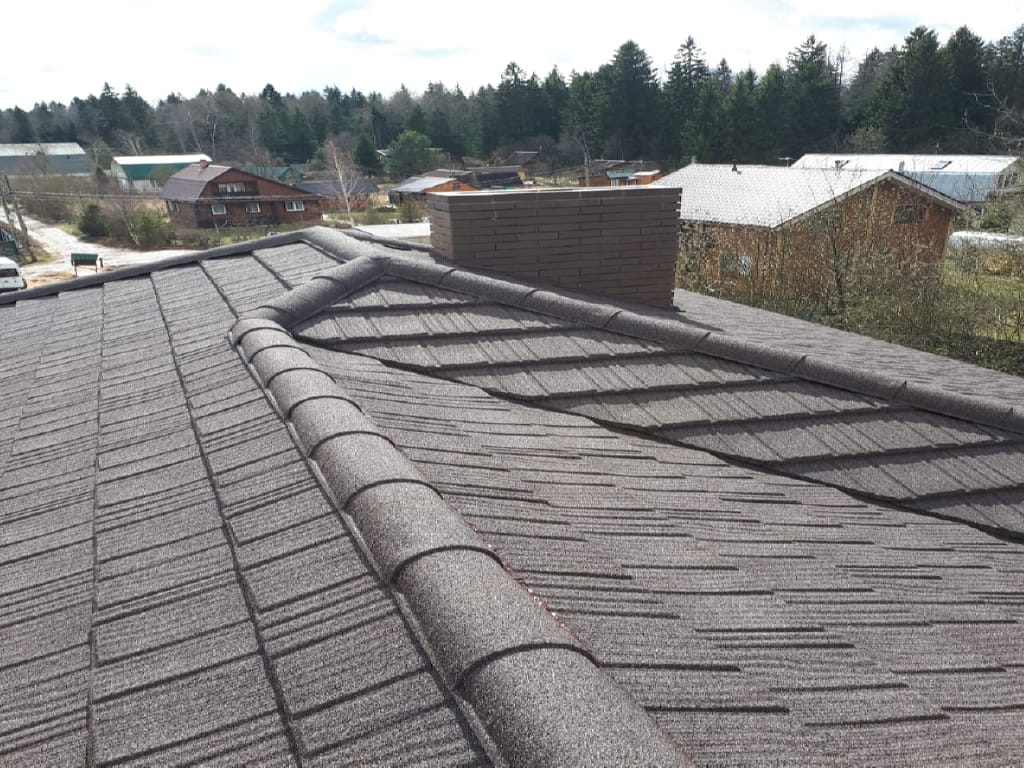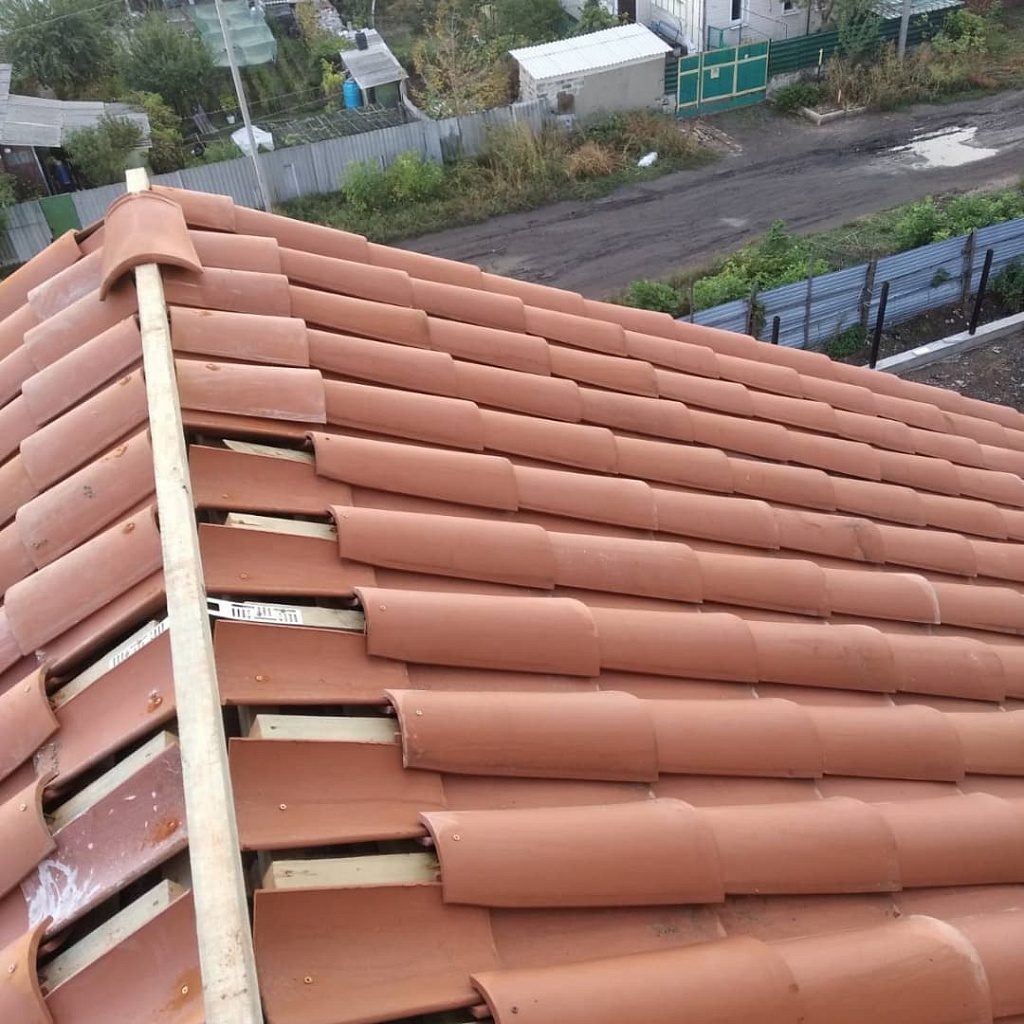 • Монтаж коньковых элементов крыши. На линии стыка скатов закрепляются коньковые планки. Укладываются детали внахлест так, чтобы следующий элемент перекрывал место закрепления предыдущего. Фиксируется коньковая черепица в четырех точках – по две на каждую из сторон.
