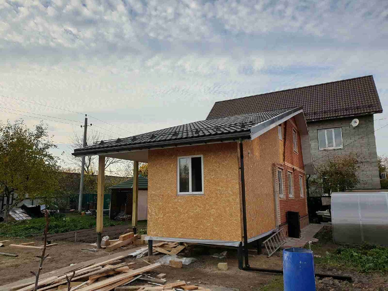 • Изготовление основания. Укладка мягкой черепицы производится на выровненную сплошную поверхность из влагостойких листов фанеры или ОСБ. Металлическая черепица и кровельный профнастил может монтироваться на обрешетку из деревянных досок;