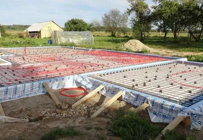 Особенностью фундамента является то, что он, в отличие от других типов, на глубину промерзания грунта не заглубляется. Перед заливкой бетонной смеси формируется основание из смеси песка с щебнем и тщательно утрамбовывается. На этом основании фундамент будто плавает, поэтому его еще называют «плавающей плитой».