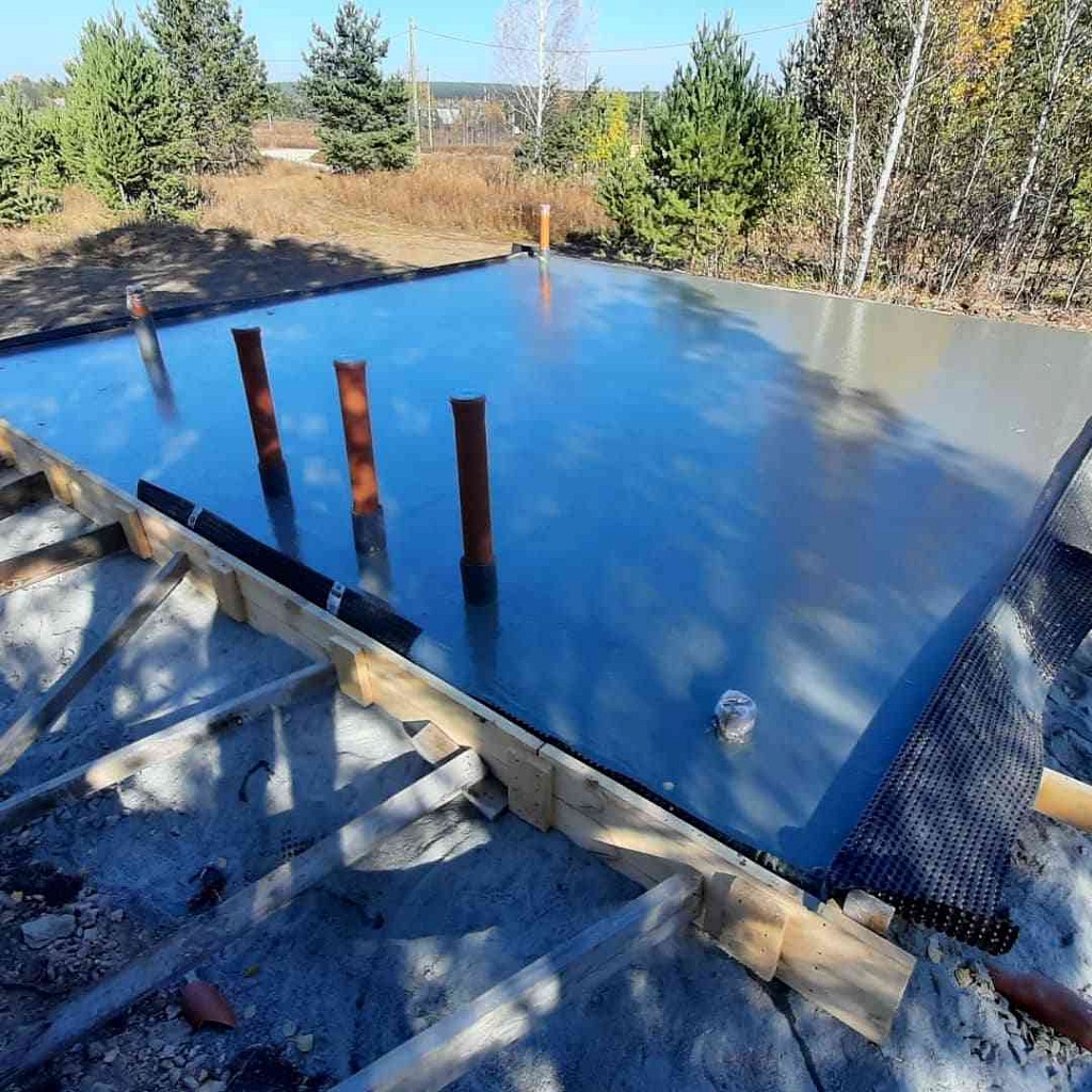 Гидроизоляцию плитного фундамента лучше осуществлять с использованием битумно-полимерных материалов. Также допустимо использование гидроизоляции рулонного типа.